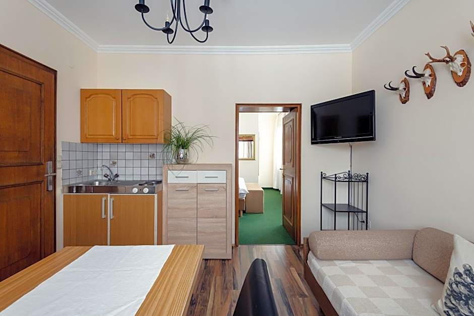 This apartment has a bedroom with a separate bathroom. There is a sitting group, a sofa bed and a flat-screen TV with cable channels in the living room.